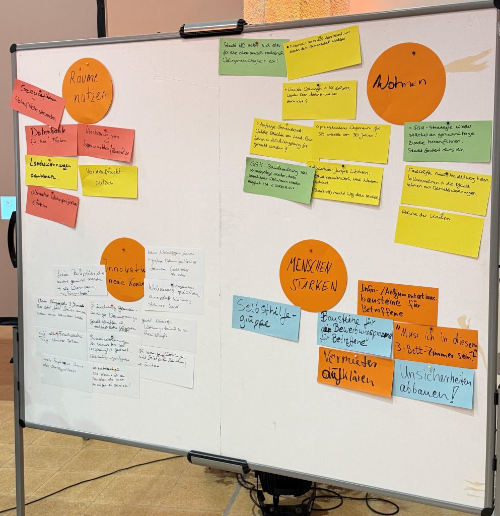 „Heidelberger Bausteine“, „Innovativ denken“, „Räume nutzen“ und „Menschen stärken“ sammelten die Teilnehmenden zahlreiche Vorschläge, Ideen und Forderungen an Stadt, Genossenschaften, Initiativen und Eigentümer:innen.